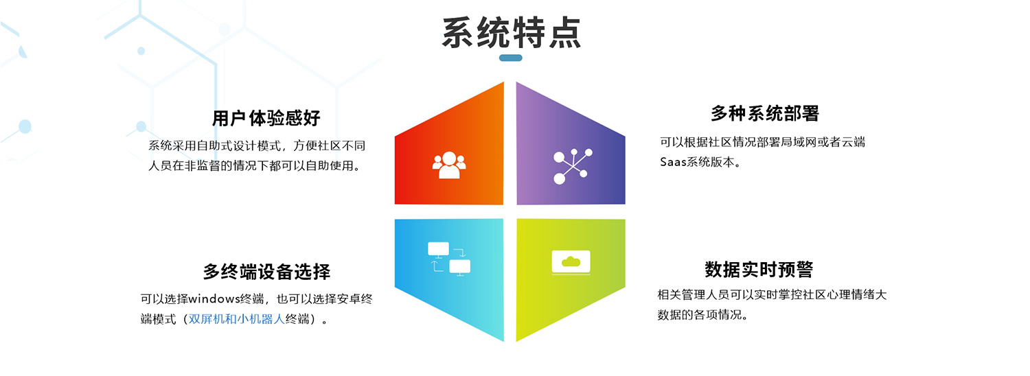 目前社會(huì)在軀體性醫(yī)療保障體系建設(shè)上已經(jīng)取得一定的成績,包括智慧社區(qū)醫(yī)療、體檢和人員建設(shè)上都很完善。但是我國在心理健康建設(shè)方面起步晚,人們心理健康思想意識(shí)不夠,沒有引起社會(huì)的足夠重視,心理咨詢職業(yè)團(tuán)隊(duì)人員短缺等問題,導(dǎo)致近年來我國因心理健康問題引起的自殺和社會(huì)事件呈增長趨勢,也導(dǎo)致社區(qū)和鄉(xiāng)鎮(zhèn)在心理健康建設(shè)方面存在一定的空白。檢信智能為社區(qū)心理健康即提供了人工智能信息化解決方案,也解決了社區(qū)及鄉(xiāng)鎮(zhèn)心理咨詢師職業(yè)人員短缺的問題。為社區(qū)建立示范性心理項(xiàng)目提供服務(wù),為國家建設(shè)社區(qū)心理最后一公里提供一站式完善的服務(wù)解決。