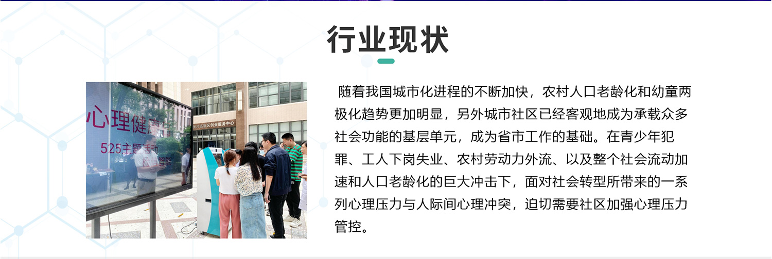 隨著我國城市化進(jìn)程的不斷加快,農(nóng)村人口老齡化和幼童兩極化趨勢更加明顯,另外城市社區(qū)已經(jīng)客觀地成為承載眾多社會(huì)功能的基層單元,成為省市工作的基礎(chǔ)。在青少年犯罪、工人下崗失業(yè)、農(nóng)村勞動(dòng)力外流、以及整個(gè)社會(huì)流動(dòng)加速和人口老齡化的巨大沖擊下,面對(duì)社會(huì)轉(zhuǎn)型所帶來的一系列心理壓力與人際間心理沖突,迫切需要社區(qū)加強(qiáng)心理壓力管控。